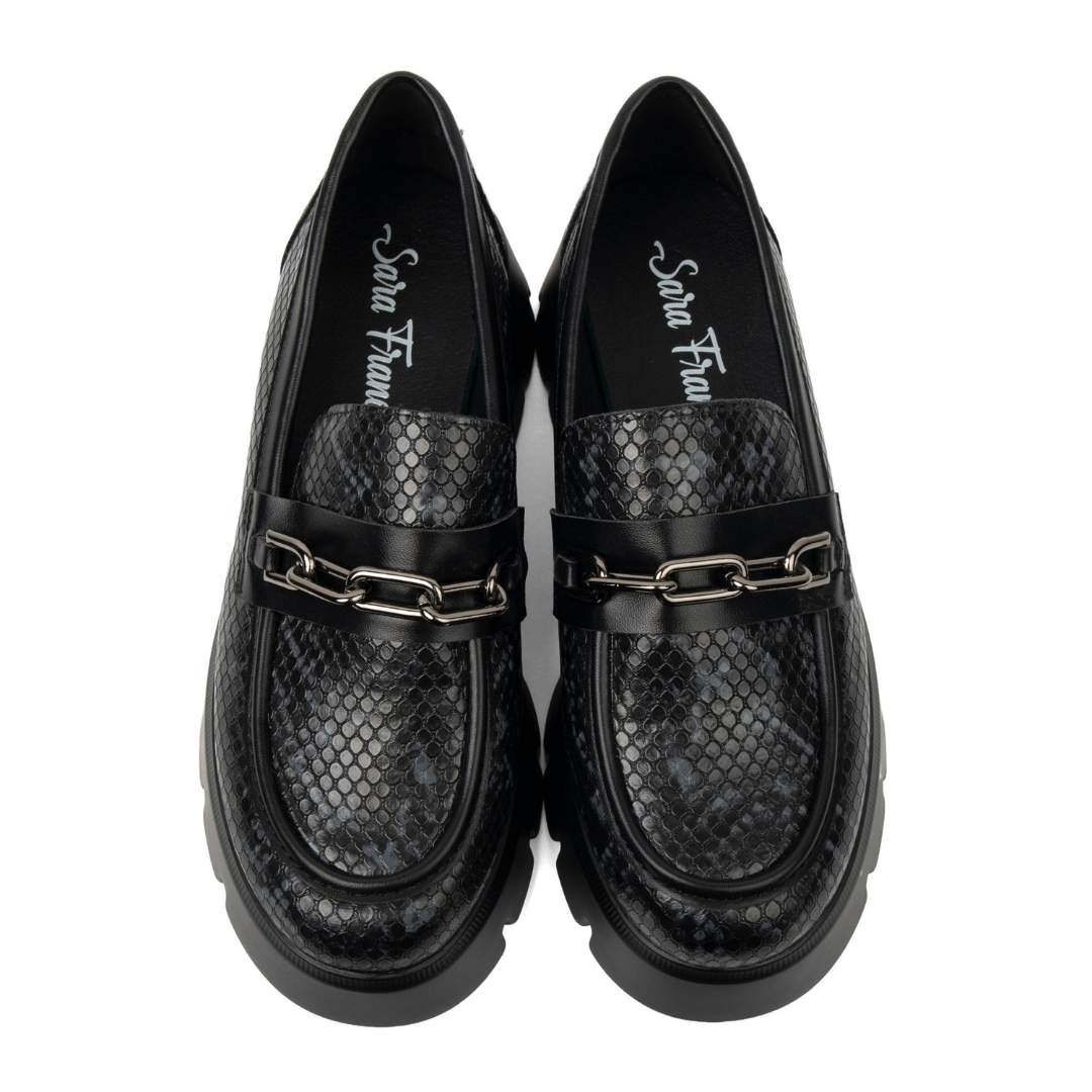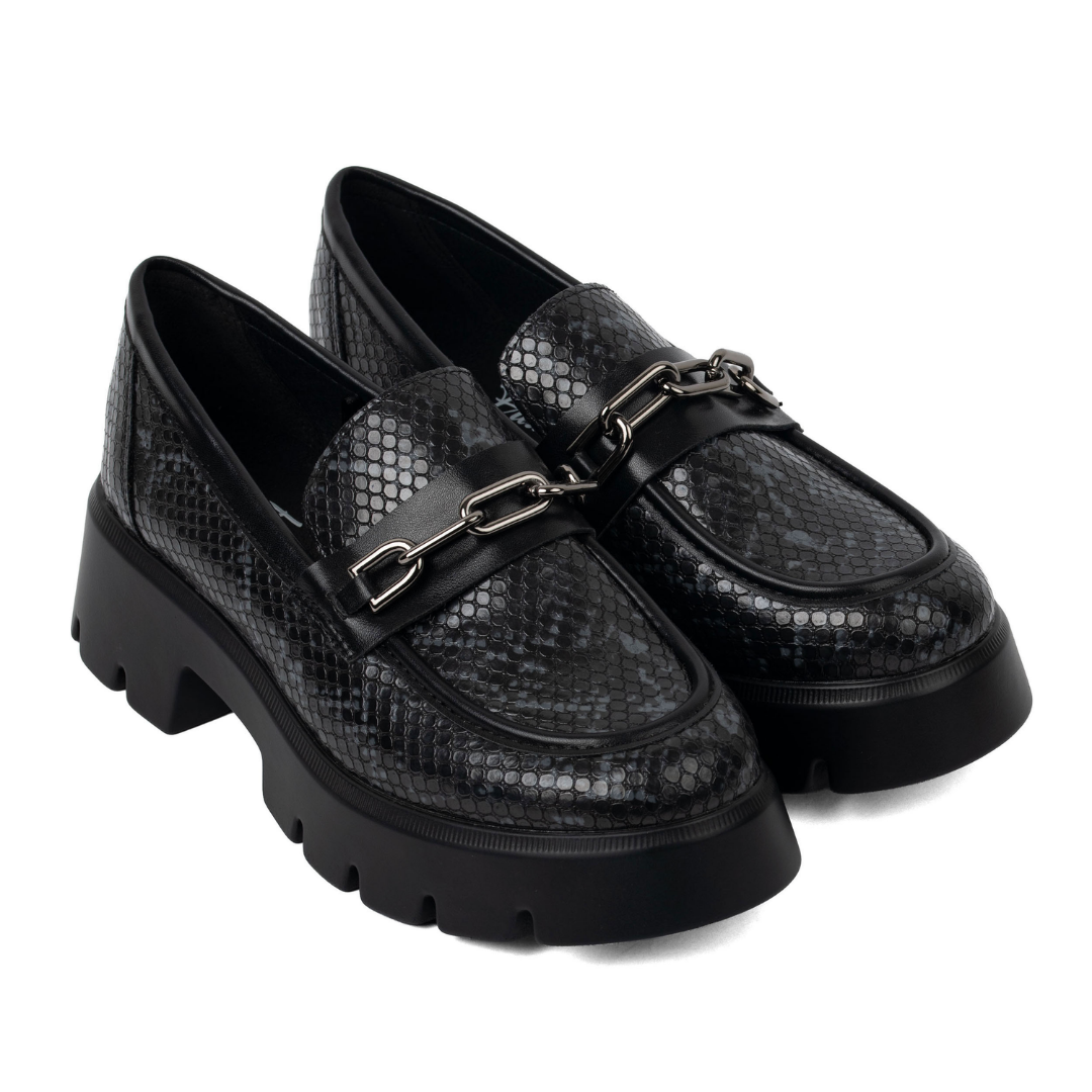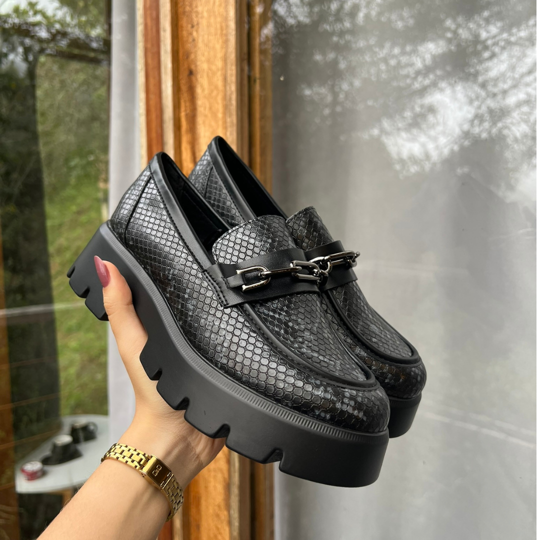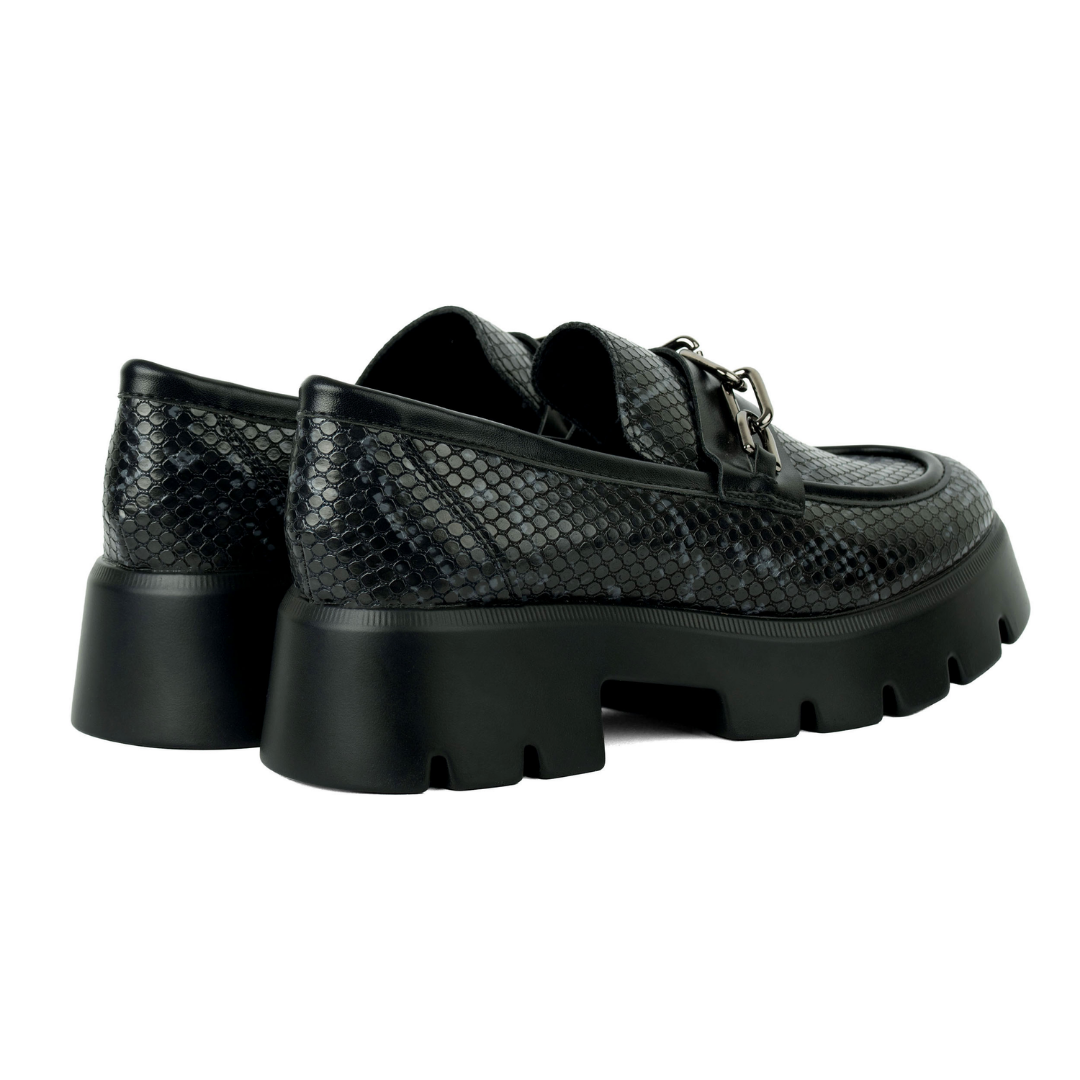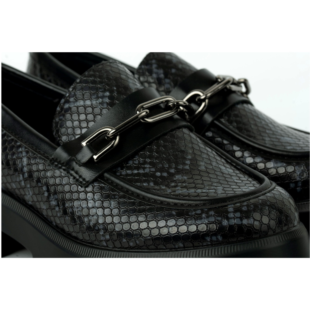 Los mocasines Nebula están hechos para mujeres que no temen ser el centro de atención. Su textura tipo serpiente, herraje metálico y suela robusta los convierten en una pieza poderosa, elegante y cómoda a la vez.